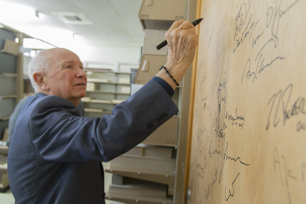 November 3, 2020, Filed Under: Authors, Featured1, Theatre + Performing ArtsCelebrating Terrence McNally Terrence McNally, who authored more than 80 plays, musicals, and opera librettos before he died earlier this year (read Texas Monthly’s tribute) was born on this day in 1938 in St .Petersburg, Florida. He graduated from high school in Corpus Christi, Texas, and became one of the most respected American playwrights due to the success of works like Master Class, The Lisbon Traviata, and Frankie and Johnny in the Claire de Lune. An LGBT activist throughout his life, McNally’s Andre’s Mother and Love! Valour! Compassion! humanized the AIDS crisis and his play, Corpus Christi, grappled with contemporary homophobia and hate crimes, according to Ransom Center curator Eric Colleary, who interviewed McNally in 2018 ahead of a special series of tribute events held at the Ransom Center and ZACH Theatre in honor of his 80th birthday. In that interview, the award-winning playwright said, “Theatre has the power to change people when all the elements—script, performance, design—are aligned in perfect harmony to reach across the stage and lift the audience en masse to a new level of awareness and collective emotional resonance.” Theatre has the power to change people…. —TERRENCE MCNALLY Terrence McNally gifted his archive to the Ransom Center in 1999 and continued adding to it in the many years after. McNally received five Tony Awards in his lifetime—for Kiss of the Spider Woman (1993), Love! Valour! Compassion! (1995), Master Class (1996), Ragtime (1998), and for Lifetime Achievement in the Theatre in 2019. He was also inducted into the prestigious Academy of Arts and Letters in 2018, one of the highest recognitions of artistic merit in the United States. He established his archive at the Ransom Center in 1999, growing it over the years to include his most recent play, Fire and Air, which premiered in 2018. Award-winning playwright Terrence McNally signing the Ransom Center’s author’s door. Every Act of Life, a documentary about McNally’s life, was directed by Jeff Kaufman and was released in 2018 (watch the trailer). View a list of his plays and see a biographical timeline (PBS.org) of his life and works. When asked what advice he might give his younger self, he said, “I would listen to my peers and not my critics. I would make sure I was always surrounded by people who were smarter than me—people I would learn something from and not feel superior to. I would travel more. I would do more things that terrified me.” McNally’s legacy lives on through his archive at the Ransom Center and on stages around the world.