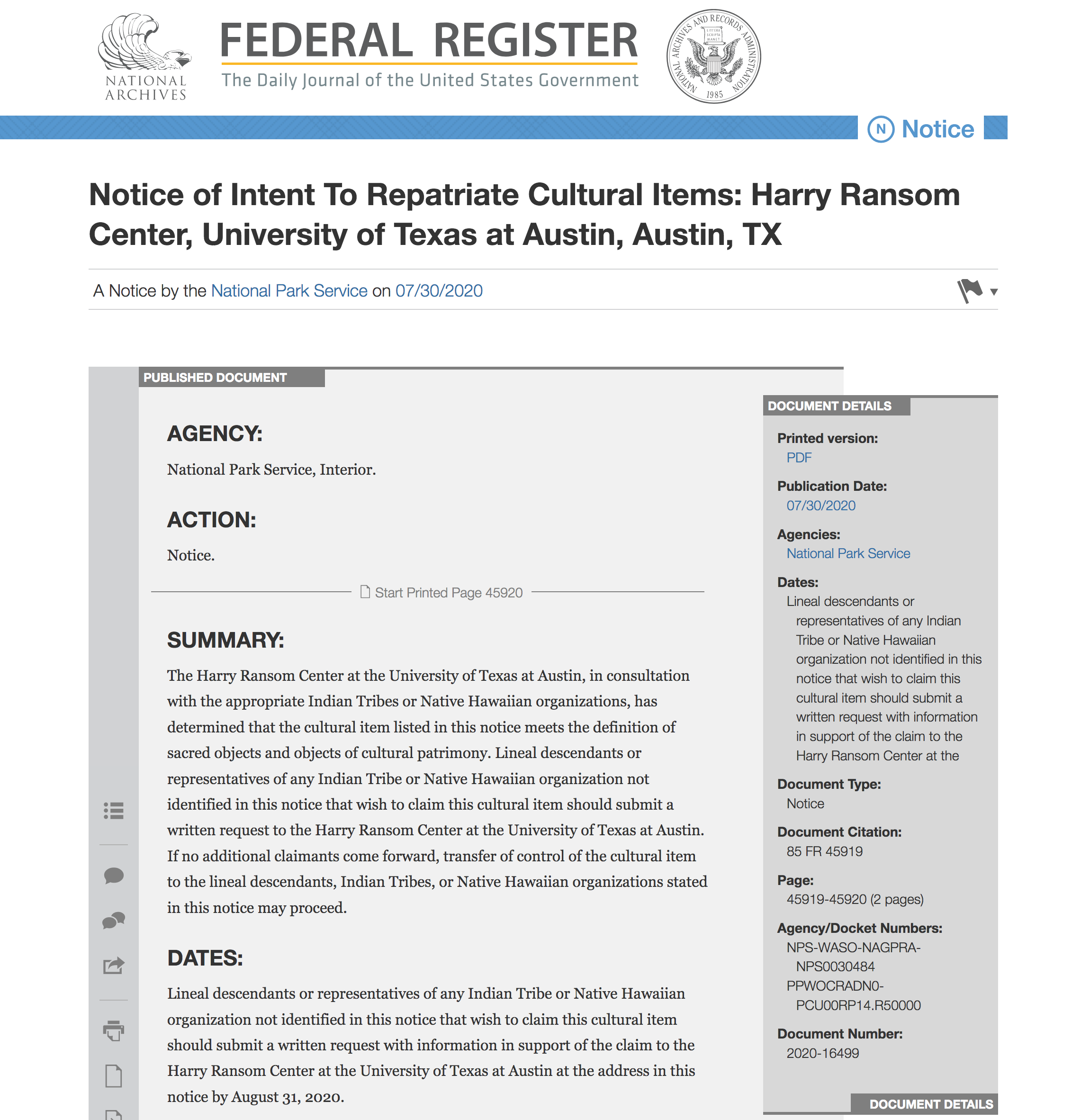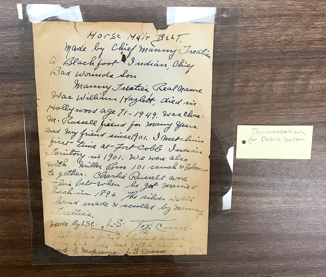 February 18, 2021, Filed Under: Art, Featured1, Research + TeachingThe Ransom Center and NAGPRA: A team effort in research by ESTER HARRISON This essay is part of a slow research series, What is Research? Learn about the series and click here to add your voice to the conversation. In 2018, a committee of staff members at the Harry Ransom Center began the process of updating the Center’s deaccession policy and procedures: a standard document that most museums and archives have in their collection management protocols. One of the laws listed in the deaccession policy is The Native American Graves Protection and Repatriation Act (NAGPRA), which directs federal agencies and institutions that received federal funding to deaccession Native American cultural items and return them to descendants of affiliated Indian tribes per statutes of this Federal Act. The deaccession committee’s project to review Native American collections at the Ransom Center was further inspired following the 2019 Flair Symposium Ethical Challenges in Cultural Stewardship, which included discussions about NAGPRA in some of the panel presentations. An example of the original documentation demonstrating the forced assimilation of Native Americans into white society, that came with a belt under consideration for NAGPRA summaries. The Native American Graves Protection and Repatriation Act [1] was enacted as a United States federal law in 1990. In the most basic terms, the purpose is for any institution receiving federal funds (including state, local, and private institutions) to return Native American human remains, funerary objects, sacred objects, and objects of cultural patrimony back to their rightful descendants and tribes. Nationally, the repatriation process had an initial deadline to notify tribes of relevant objects in collections by 1995, but that work actively continues to this day [2], as both institutions and tribes continue to sort through the inventories, make claims, and process claims through the formal procedures outlined in the law. There is no deadline for tribes to file a claim for repatriation of objects once an object is identified and presented to NAGPRA or tribal records. In the meantime, these objects are now managed with a greater respect to Native American cultures; they are not exhibited, loaned, photographed, or generally handled without tribal consultation and consent. The Ransom Center’s Flair symposium panel, Ethical Challenges in Cultural Stewardship: Ethical Collection Management, took place in April of 2019 and focused on the evolving responsibilities of institutions that are stewards of the past. One of the challenges within the Center’s oldest collections is that vital provenance information from the original collector, the estate, or the curator was sometimes not documented or misidentified in the acquisition, prior to more formalized and modern collection management practices. Especially in the case of Native American materials, which have never been a formal part of the Center’s mission or curatorial specialties (but came into the collection as part of large archives and donations), these works have often gone misidentified, unidentified, or overlooked for decades. This is certainly not a problem unique to the Ransom Center—in fact, all museums of a certain age have historic items in their collections that lack accurate or rigorous documentation. Thanks to advances in collections management, registration, and curation practices and standards, the field has immensely improved, but unfortunately, we cannot go back in time to correct the original inaccuracies and omissions. The research we conducted at the Center was an attempt to rectify the assumptions and insensitivities of our predecessors. Part of that art market and grab of objects and ancestors from the ground came with fabricated stories of what the provenance of those items actually were in order to separate them from their original peoples, and also to create a more romantic or different story that had a more Western perspective of an interpretation than what the object truly was. And truly those objects are not objects of art, nor were they created by artists. But they were living breathing objects still being used today for tribes. —SHANNON KELLER O’LOUGHLIN, Exec. Dir., Association on American Indian Affairs To begin our research, Ransom Center Archivist and Collections Librarian Steve Mielke developed a search strategy and conducted an extensive review of records from multiple collections databases to find terms in descriptions that might point to materials classified as “Native American.” The Deaccession Committee, which included Associate Director for Library Division, Hobby Foundation Librarian Jim Kuhn; Associate Director for Administration and Curatorial Affairs Megan Barnard; Mielke, and myself as the Art Registrar for Loans & Exhibitions, reviewed this list, looking for any and all works that could fit the categories under NAGPRA. In case something was not originally identified as belonging to a Native American tribe, we discussed what types of items could be considered sacred or of cultural patrimony. Revised searches were done to identify records that matched more characteristics. We also asked all of our curatorial staff to review the results and to suggest any other works that may have been overlooked. …all museums of a certain age have historic items in their collections that lack accurate or rigorous documentation. Thanks to advances in Collections Management, Registration, and Curation practice and standards, the field has immensely improved on this practice, but unfortunately, we can’t go back in time to correct the original inaccuracies and omissions. The research that we conducted at the Ransom Center was in an intent to rectify the assumptions and insensitivities of our predecessors. —ESTER HARRISON For my own role in this committee, I helped to research some of the anonymous obje