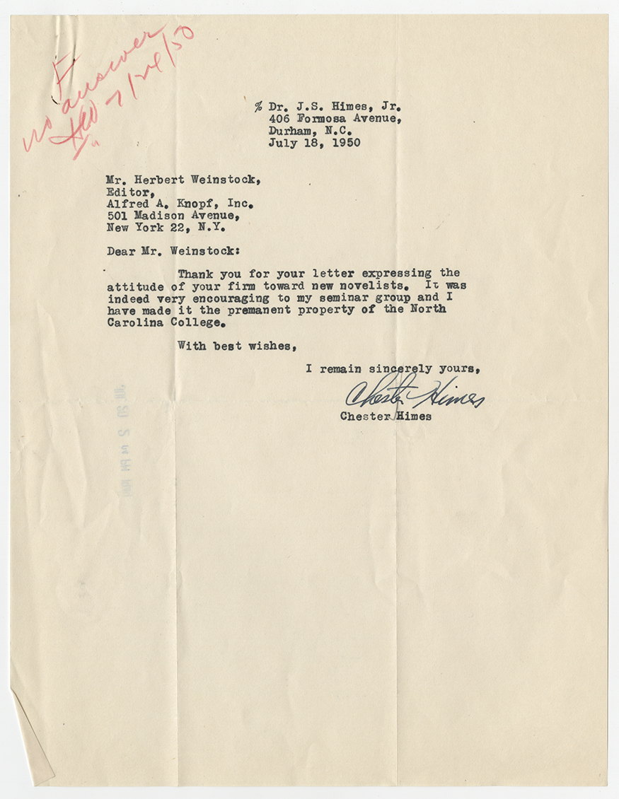 February 26, 2021, Filed Under: Authors, Books + Manuscripts, Featured1Knopf archive reveals details about Lonely Crusade author Chester Himes Many writers and artists through history have developed their craft, and even published, while they were imprisoned. Among them is Chester Himes, an African American author who wrote about racism, prison life, and who is best known for his Harlem Detective series. Records related to Himes are found in the Alfred A. Knopf, Inc. archive, which documents the history of the well-known publishing house. The papers contain correspondence, publicity materials, and/or manuscripts from a number of other African American writers, including James Baldwin, Lorraine Hansberry, Langston Hughes, Zora Neale Hurston, James Weldon Johnson, John Oliver Killens, Nella Larsen, Alain Locke, Claude McKay, and Walter White. Himes was born in Jefferson City, Missouri in 1909. Of his adolescence, Himes wrote that he was “lonely, shy, and insufferably belligerent.” 1 Himes was incarcerated at Ohio State Penitentiary at the age of 19, and two years into his 20-plus-year sentence for armed robbery, his first short story was published in an African American–owned magazine, The Bronzeman, in 1931. He also sold articles to Esquire, such as “Crazy in the Stir,” which appeared with the chilling byline “59623,” his prison number. Knopf’s Manuscript Record for Chester Himes’s novel Lonely Crusade, 1946–1947. Alfred A. Knopf, Inc. Records, 1363.3. Harry Ransom Center. After his release from prison during the Depression, he held dozens of jobs while focusing on writing novels, screenplays, and making connections with other writers. Himes favored protagonists who were less than heroic or likable, and the enthusiasm for his fiction by other African American writers was often tepid. However, Langston Hughes supported him by introducing his work to his own publisher, Blanche Wolf Knopf. Knopf asked Hughes to provide a blurb for Himes’s second novel, Lonely Crusade (1947), a novel exploring racism and labor strife during World War II, but Hughes demurred. His reason? “Most of the people in it just do not seem to me to have good sense or be in their right minds; they behave so badly, which makes it difficult to care very much what happens to any of them.” 2 The dust jacket for Chester Himes’s novel Lonely Crusade, 1947. Alfred A. Knopf, Inc. Records, 1221.5. Harry Ransom Center. In the summer of 1950, Himes taught a popular creative writing seminar at the North Carolina State Negro College in Durham, where for two weeks he was a celebrity figure. Below is Himes’s letter of gratitude written to Knopf music editor Herbert Weinstock for his publication advice to “new novelists.” 3 Chester Himes’s letter to Herbert Weinstock, July 18, 1950. Alfred A. Knopf, Inc. Records, 68.7. Harry Ransom Center. Editorial Vice President Seymour Lawrence received this letter in 1964 from Himes, who by this time had expatriated to Paris. Himes writes that he felt it was time for him to publish his memoirs and in this letter, requests an advance on royalties of $400 per month for two years. The Quality of Hurt, volume one of his autobiography, was published by Doubleday in 1971. Chester Himes’s letter to Seymour Lawrence, November 4, 1964. Alfred A. Knopf, Inc. Records, 411.4. Harry Ransom Center. Between 1957 and 1969, Chester Himes eventually found popularity in France for his Harlem Detective novel series featuring detectives Coffin Ed Johnson and Gravedigger Jones. Ishmael Reed wrote that Chester Himes was “[A] great writer and a brave man. His life has shown that black writers are as heroic as the athletes, entertainers, scientists, cowboys, pimps, gangsters, and politicians they might write about.” 4 [1] Chester Himes, The Quality of Hurt, (Paragon House, 1990), 14. [2] Arnold Rampersand, The Life of Langston Hughes, (Oxford University Press, 1986 and 1988), 134. [3] James Sallis, Chester Himes: A Life, (Walker & Co, 2000), 32. [4] Stephen F. Milliken, Chester Himes: A Critical Appraisal, (University of Missouri Press, 1976), 220.