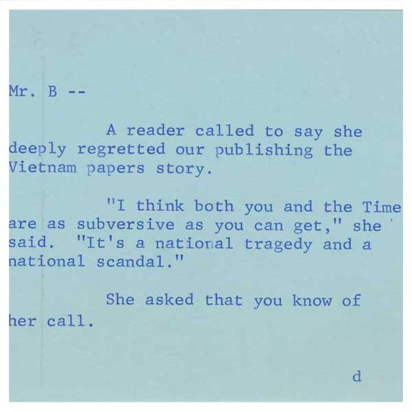 December 5, 2017, Filed Under: Featured1, Research + Teaching“A Frightening Time in Our History”: Public reaction to the Pentagon Papers In recent weeks, two separate films have depicted the career of the late Washington Post Executive Editor Ben Bradlee. The HBO documentary The Newspaperman, which premiered December 4, tells Bradlee’s story through a combination of interviews and archival footage.