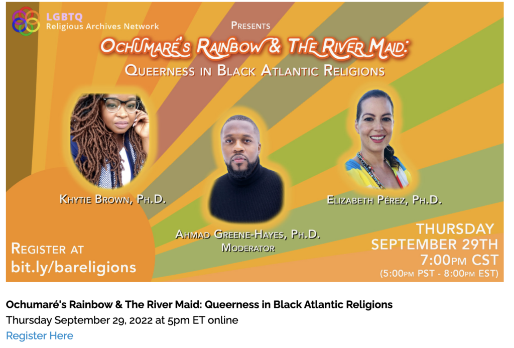 On Thursday, September 29, 2022, Dr. Khytie Brown, Assistant Professor of Religious Studies, introduced an online event’s audience to River Mumma, “a vengeful mermaid who resides in the rivers of Jamaica.” Her talk was part of a webinar on Queerness in Black Atlantic Religions sponsored by the LGBTQ Religious Archives Network, an organization that preserves and encourages scholarly study of the history of LGBTQ religious movements around the world.