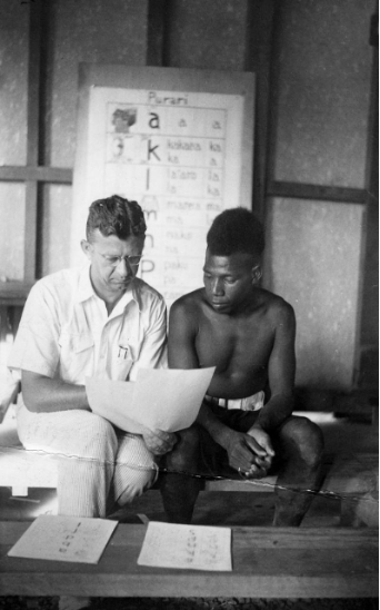 Rev. John Kuder, superintendent of the Lutheran mission, teaches a man (identified only as a “police boy”) to read Tok Pisin during the Lae literacy conference in 1949. “Police boys” were adult laborers who worked for the colonial Papua New Guinea police force (Archives of the Evangelical Lutheran Church of America, TALC 16.8.1. b5 f19). Courtesy of Dr. Courtney Handman.