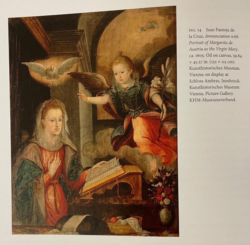 In the first chapter, Jasienski considers portraits of royal women, like Annunciation with Portraits of Margarita de Austria as the Virgin Mary, created by Juan Pantoja de la Cruz in 1605 (above). Jasienski notes that this portrait has been previously interpreted as visual evidence for a monarch’s reign as divinely sanctioned. In contrast, Jasienski follows the argument that unlike its European counterparts, the Spanish monarchy was not sacred, due to not following the same rituals or wearing the trappings of power such as crown and scepter (25). The painting shows the queen Margarita of Austria (wife of Phillip III) and her daughter Ana enacting the scene of the annunciation with Margarita as the Virgin and Ana as the Archangel Gabriel. In order to explain the portrait of the Queen as the Virgin as well as other analogous portraits produced around the same time, Jasienski argues that the portraits were produced for personal devotion, specifically the constant labor needed to dismantle selfhood. The idea being, only after dismantling her own selfhood could the queen look at the portrait of herself and see the Virgin (32). The process Jasienski believes the queen went through, in order to dismantle her sense of self, involved meditative practices such as Ignatius of Loyola’s Spiritual Exercises administered by her Jesuit confessor, Richard Haller. “That Haller was a Jesuit is crucial here, she would have exposed Margarita to period forms of eschatologically motivated meditative practice, likely including Ignatius of Loyola’s Spiritual exercises…which announces that the goal is for the exercitant—or practitioner—to… ‘vanquish oneself’” (32). Although, as the authors states, there is no evidence that the queen undertook this exercise, there were arguments within the order about whether women could be administered the Exercises (32).