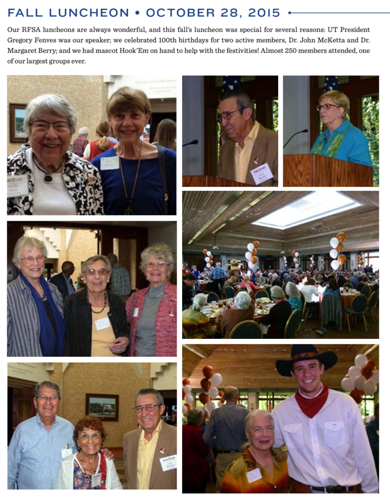 UT President Fenves Addresses RFSA MembershipJohn McKetta’s 100th Birthday CelebrationPam O’Conner and Ruth Crawford at Fall LuncheonNorm and Sytha MinterClem & Pauline Lopez, Cecil MartinezClemith HoustonDudley Dobie and Lin ShiversJohn McKetta’s 100th BD (Photo by D Kincaid) Joyce Harris & Judy DavisRFSA President Nancy Payne and Bevo