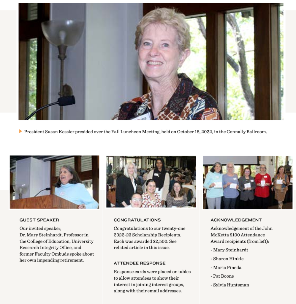 Susan Kessler, PresidentChecking in…Fabulous food (mashed potatoes were to DIE for)Enjoying lunchBarbara Myers, pianistMcKetta Prize Winners: Mary Steinhardt, Sharon Hinkle, Maria Pineda, Pat Boone, Sylvia HuntsmanSusan Kessler (President) appreciates our speaker, Dr. Mary SteinhardtWell, YES!Enjoying lunch while Sponsor ads are projectedOur guest speaker, Dr. Mary SteinhardtScholarship RecipientsCraig Champlin (new member) and Bill Lasher (Treasurer)Enjoying lunch while Scholarship recipient slide show is projectedAnnela, Sherry and JuliePhil and Karen Kelton with ???RFSA Interest GroupsNeal Rhea and Dudley DobieSharon Justice (Queen member at large) and Joyce McClendonBeautiful day for a luncheonTravel Information: Sybil and Keith MomiiTany Norwood (past president, Sister 1), Holly Thompson (webmaster, Sister 2)and Margaret BordenAlice Reinartz and Bobby InmanCarol Obianwu and Olajumoke EwedemiThe Eyes of Texas are Upon You…