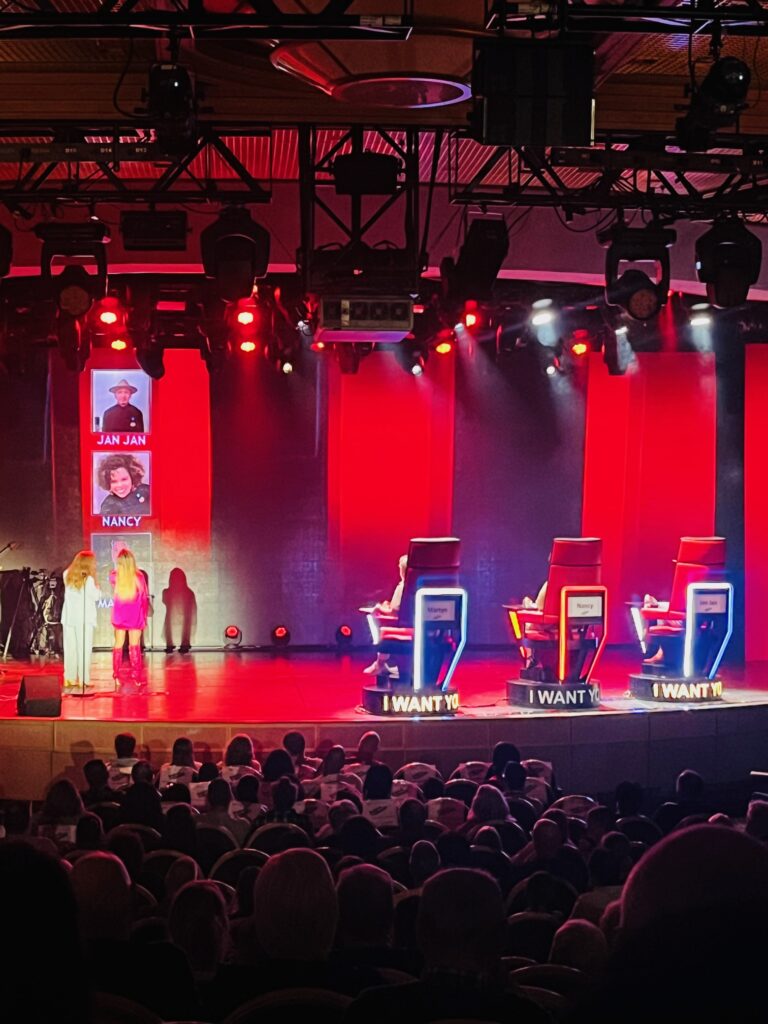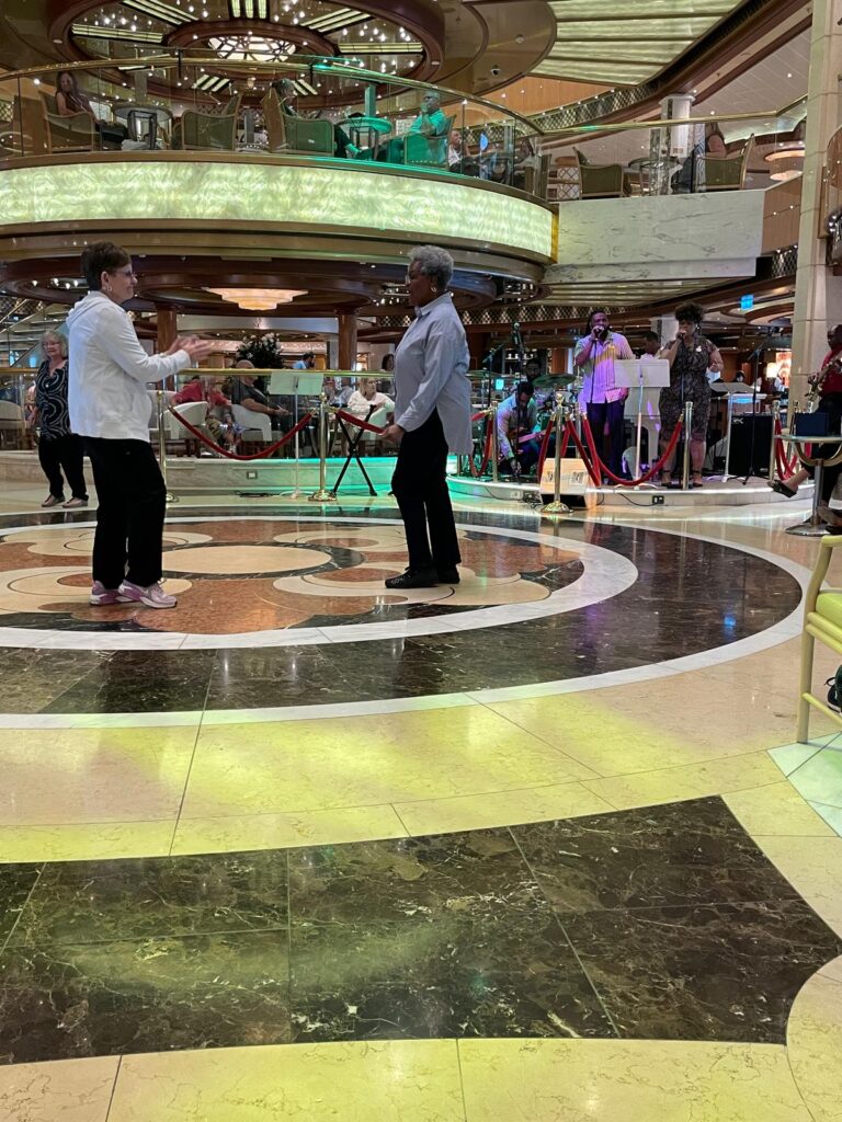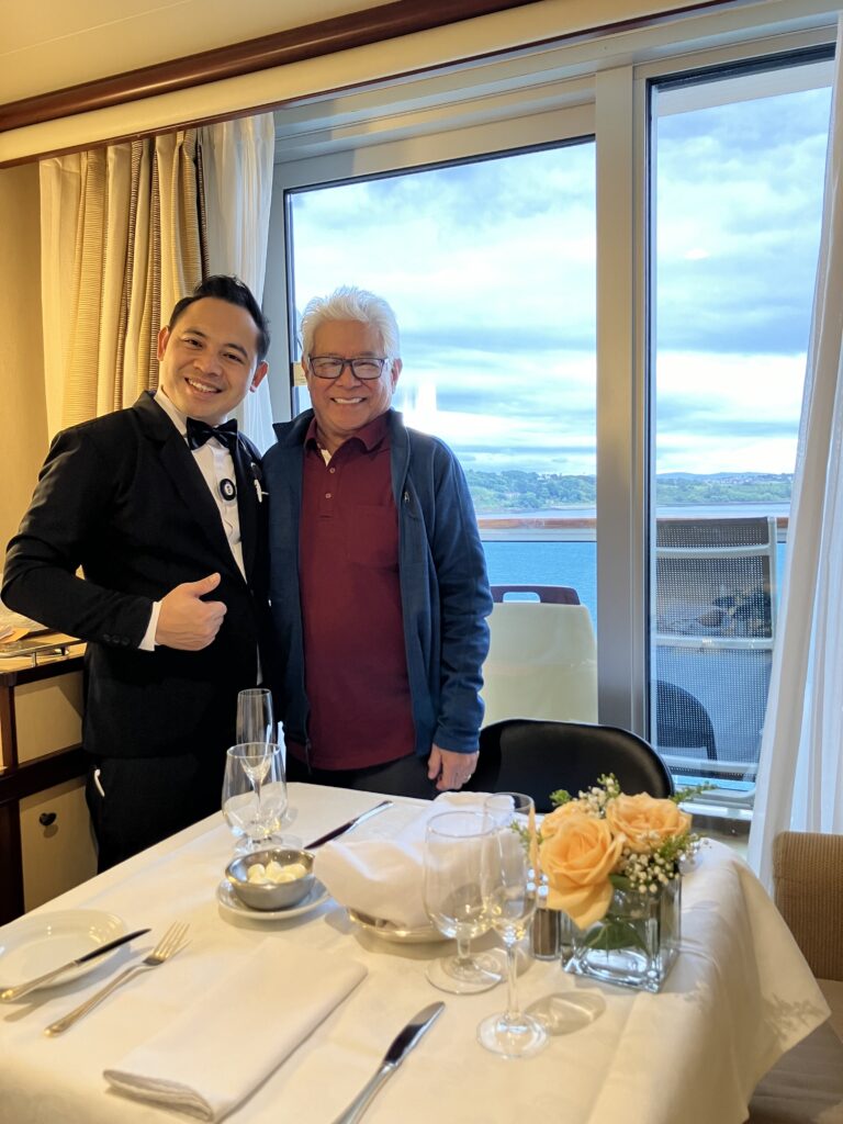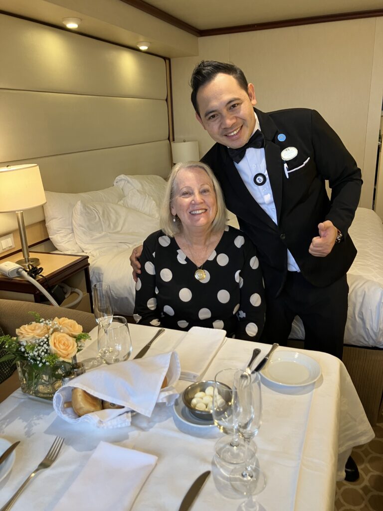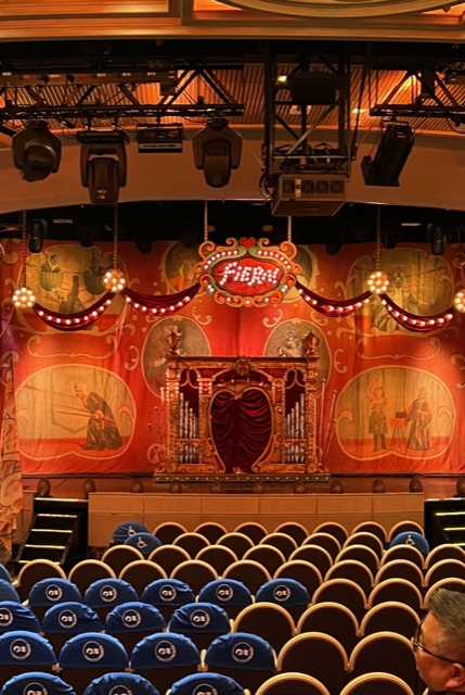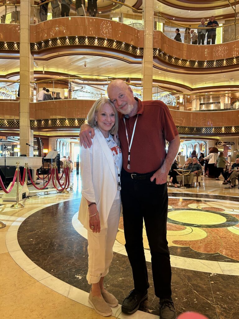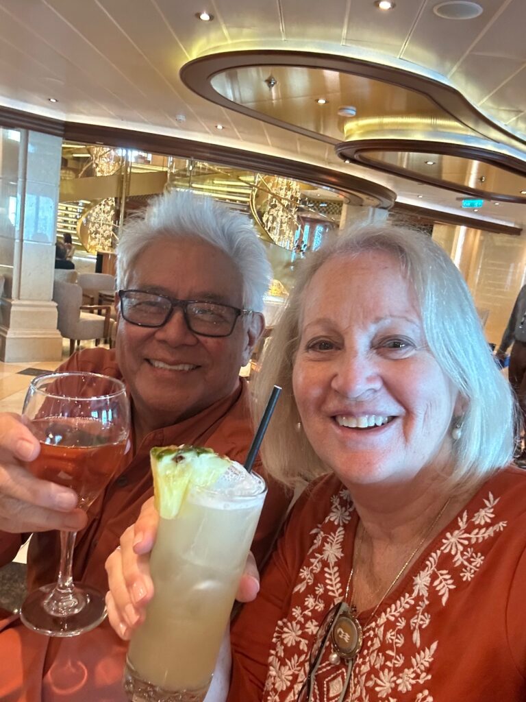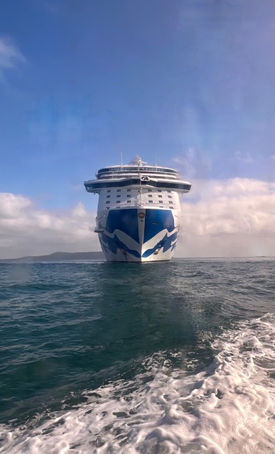 The Regal Princess has more than 1400 balconies, a glass-floor walkway extending 28 feet beyond the edge of the ship, fabulous sweeping views and holds 3560 guests and 1346 crew members. It was built in 2014. It includes 19 decks, 1780 guest cabins and was christened with the original cast of “The Love Boat”. It is 1083 feet long, 217 feet high and weighs 142,229 tons!