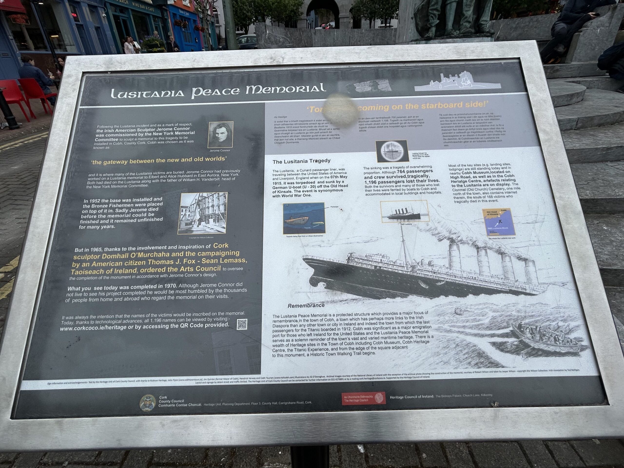 Cobh (pronouced “cove”) is a seaport town on the south coast of County Cork, Ireland. Cobh (then known as Queenstown) was the final port of call for the Titanic before she set out across the Atlantic on the last leg of her maiden voyage. 123 passengers boarded at Cobh, with only 44 surviving the sinking.