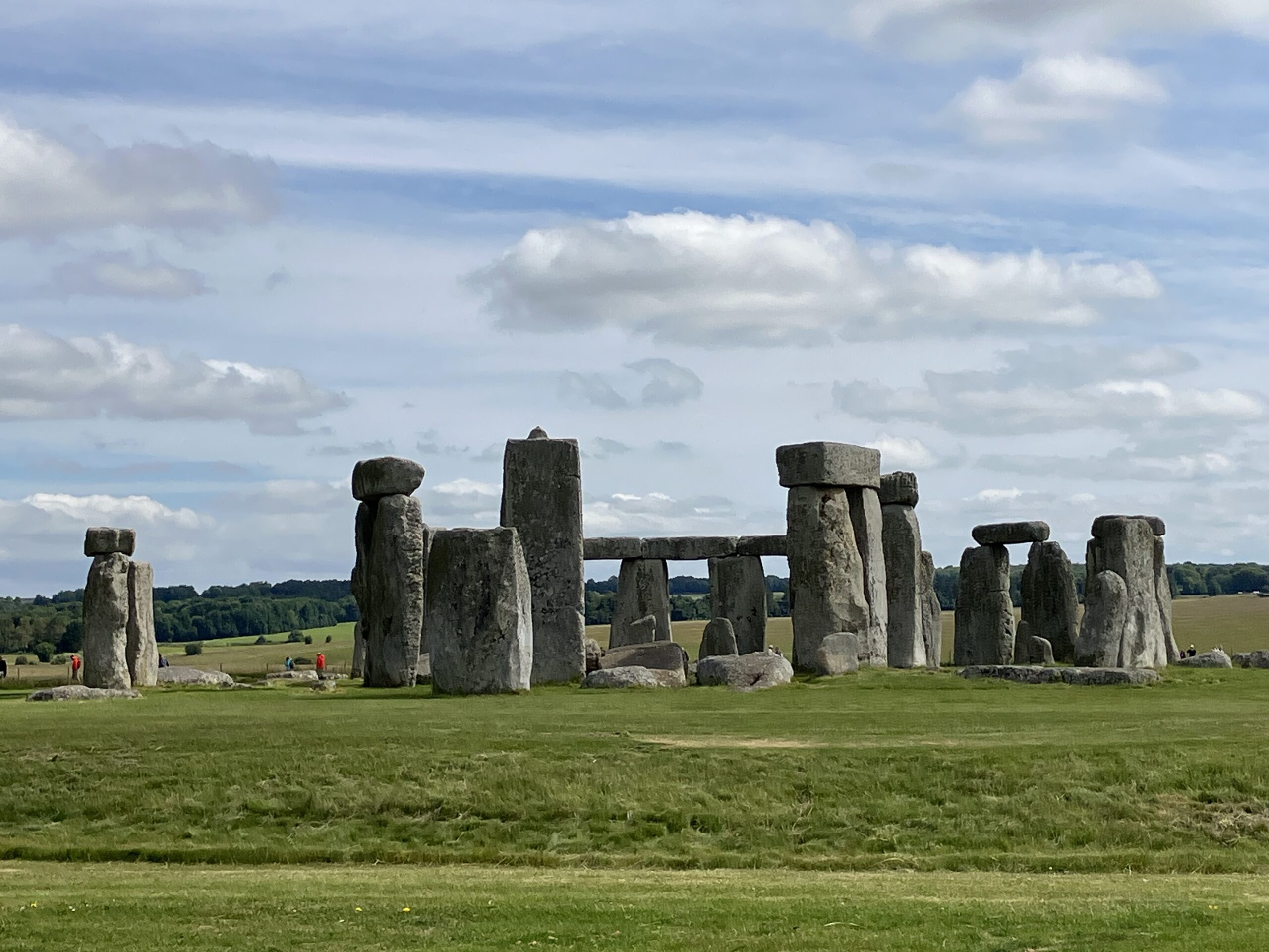 Stonehenge is a prehistoric megalithic structure on Salisbury Plain in Wiltshire, England. It consists of an outer ring of vertical sarsen standing stones, each around 13 feet high, 7 feet wide and weighing around 25 tons, topped by connecting horizontal lintel stones. Inside is a ring of smaller bluestones. Inside these are free-standing trilithons, two bulkier vertical sarsens joined by one lintel. Stonehenge is believed to have been constructed in several phases from around 3100 B.C. to 1600 B.C.