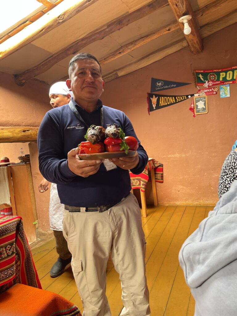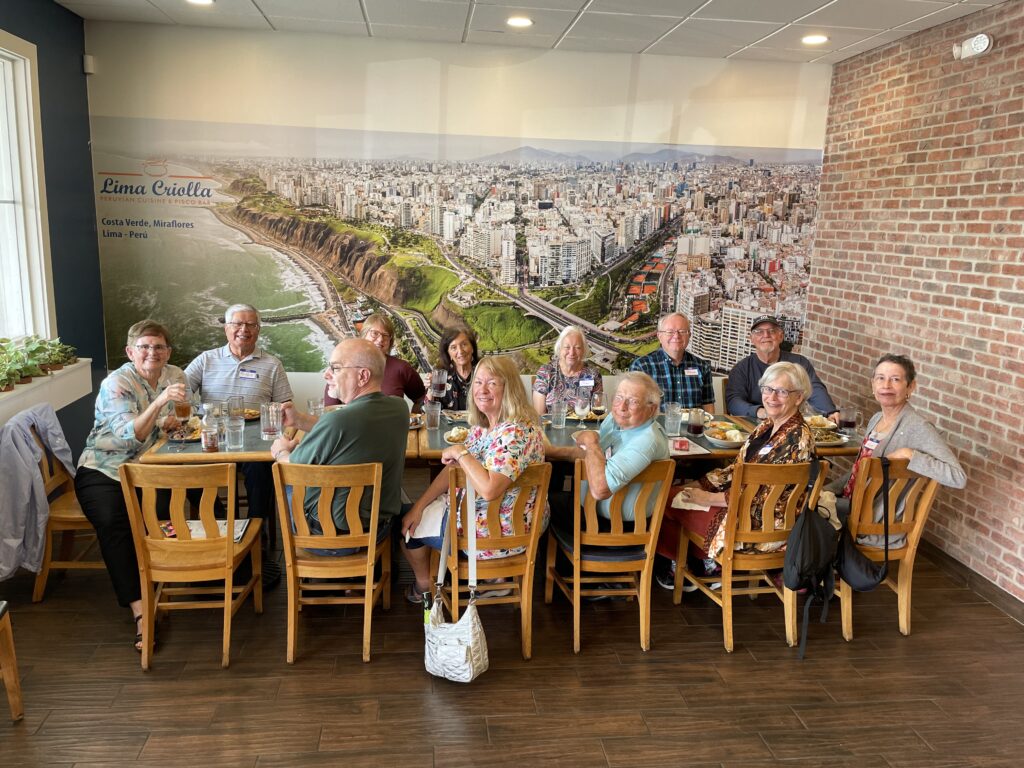The Peru travelers enjoyed a pre-trip lunch at a Peruvian restaurant. 12 local travelers plus 4 non-attendees (from out of town)! They enjoyed trying out the cuisine and sitting in front of a mural of Lima, Peru!
