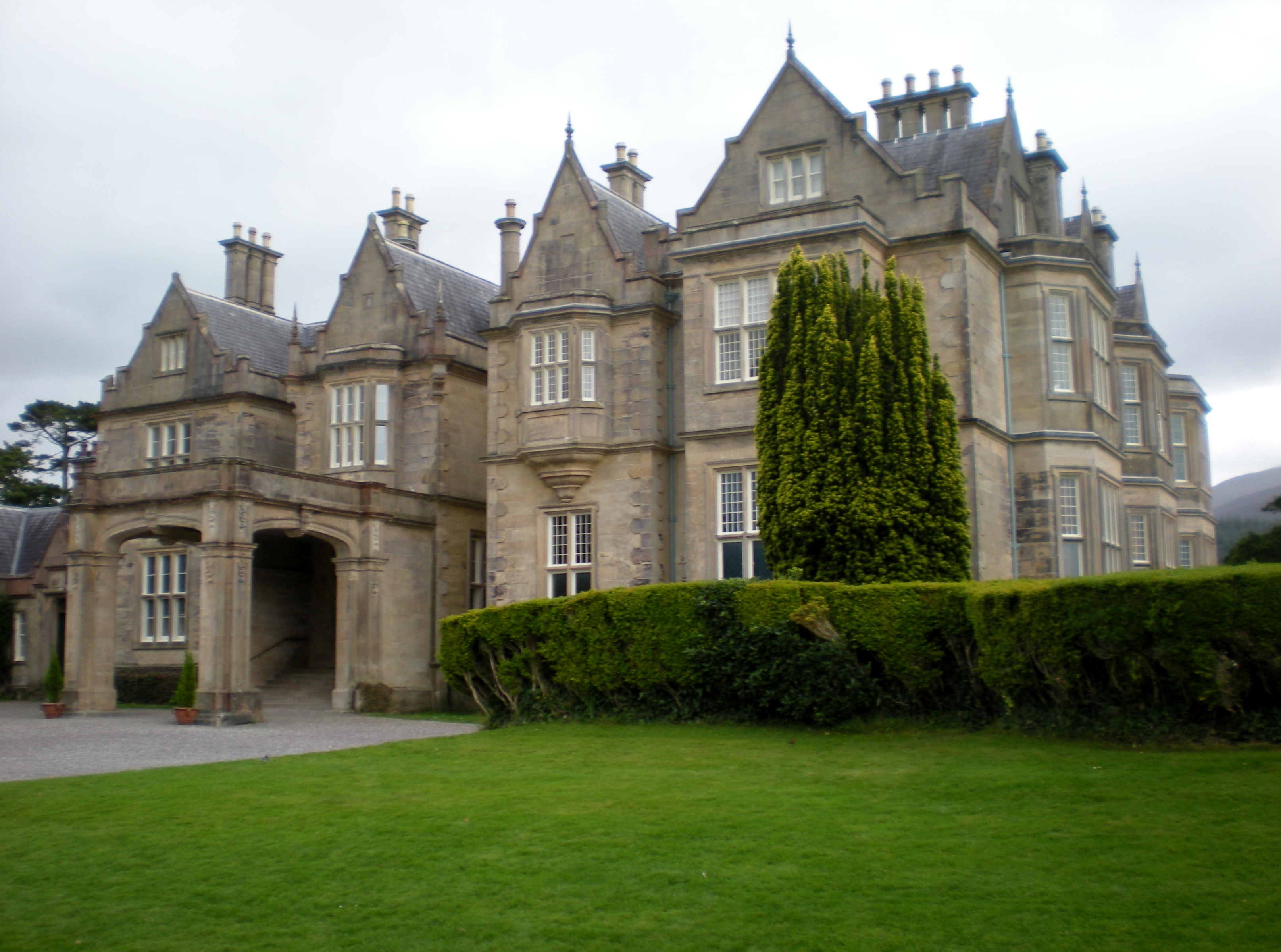 We arrived at Ross Island for a boat ride on the Killarney Lakes where most of us were dropped off by Ross Castle and we walked to the docks beside it. The bus left with the others who had chosen to tour the Muckross House. We boarded a few 12 passenger motor boats and glided past beautiful scenery in the black water of Lough (Lake) Leane of the Lower Killarney Lakes. The water is black because of the tannin in the peat bog below staining the water. We approached Innisfallen Island that had the ruins of the ancient Innisfallen Monastery and debarked. We were able to explore at our leisure and found there were many deer there as there were no natural predators on the island. The ruins were quite interesting to look at up close and there were two very large trees with winding and intertwining roots and rocks at the base. We went back the way we came to Ross Island and picked up those at the Muckross House. The 65 room Victorian Muckross House mansion was built from 1839-1843 on an 11,000 acre estate within the Killarney National Park. Several of the rooms were toured as well as the basement which was the kitchen and 32 bells were seen for the servants. It made one feel as if they had toured Downton Abbey. It was close to three lakes and the grounds were well manicured and lovely.