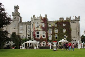 We drove south, crossing back into the Republic of Ireland on our way to Kingscourt and Cabra Castle, our last night’s lodging. It was very large and very impressive. Our guest rooms were in two story rows of buildings behind the castle that perhaps had been quarters of workers long ago. The rooms, opened with skeleton keys, have been refurbished and furnished with lovely antique pieces. There was also a wedding going on that evening in another part of the castle so we periodically saw guests dressed very fancy for that, with women in hats. We had time to wander around the beautiful castle and grounds before we had our farewell dinner in the third floor Gallerie room. John had told us earlier we had been his best group and we thought he probably told all his groups that. At dinner he told me privately that we really were his best group because we all just melded together and got along very well, plus we were fun. (We always have had a great group for our travel.) After dinner several of us gathered under a covering on the terrace for drinks and talk, then back to our rooms to get ready for departure the next morning.
