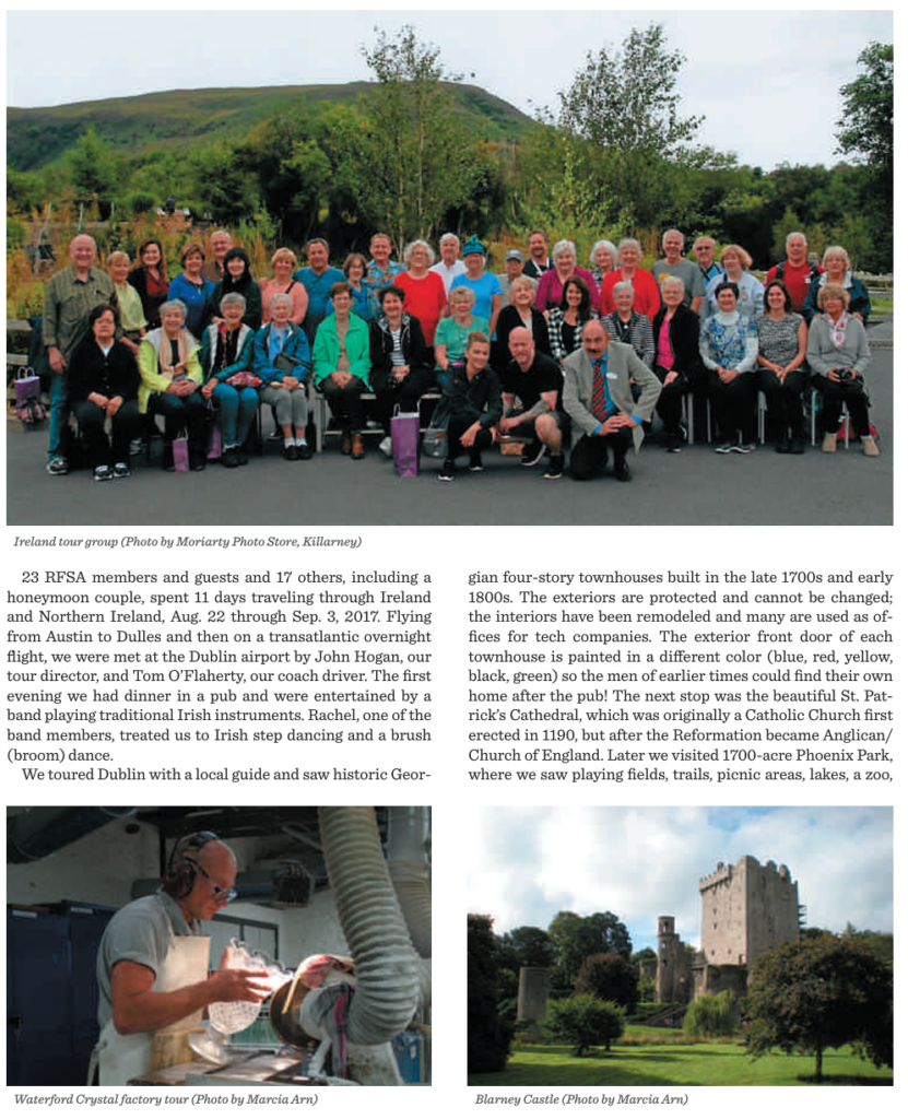 We arrived in Dublin a little after 10 am on Aug 23, met our tour director, John Hogan, and were taken to our hotel to leave our luggage there safely until rooms were ready. Besides our RFSA group of 23 members and guests, there were 17 other people with us, including a couple on their honeymoon! We were dropped off in the center of town to spend a few hours to explore on our own. Some went to nearby Trinity College, shopped, had lunch, went to museums or just walked around. Some of us made a stop at the National Gallery of Ireland, then walked down O’Connell Street as far as the General Post Office. We were picked up at 4 pm to check into our hotel rooms and a bit later went to a pub for dinner. The entertainment was the Irish House Party band, a group of four who played Irish instruments, Declan on the black flute, Rachel on the bodhran drum that is shaped like a big tambourine, held with one hand inside and hit quickly by a double headed stick with the other hand, and Tyra on the uilleann pipes, a strictly Irish instrument that sounds nicer than bagpipes, with two smallish bellows squeezed alternately under the elbows, pumping the air into the chanter (no mouth blowing) that she fingered for the different notes. This was the instrument played in the movie Braveheart, rather than bagpipes. Jerry, the lead vocalist, played the bouzouki, which is like a round guitar with a flat back. It may have originated in Greece as it is played in their traditional music. The music was interesting and fun, and Rachel also did Irish step dancing for us, as well as a brush (broom) dance. It was a great evening.