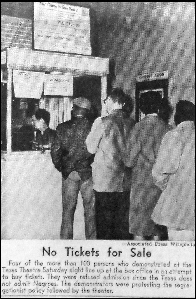 On Saturday, December 2, 1960, a biracial group of about 100 students – including 20 African Americans – lined up at the box office in front of the Texas Theater, where a CVS pharmacy store is today. As each person approached the ticket window, they would ask the employee, “Is this theater open to all Americans?” When told admission was segregated, they thanked the ticket-seller and returned to the back of the line.