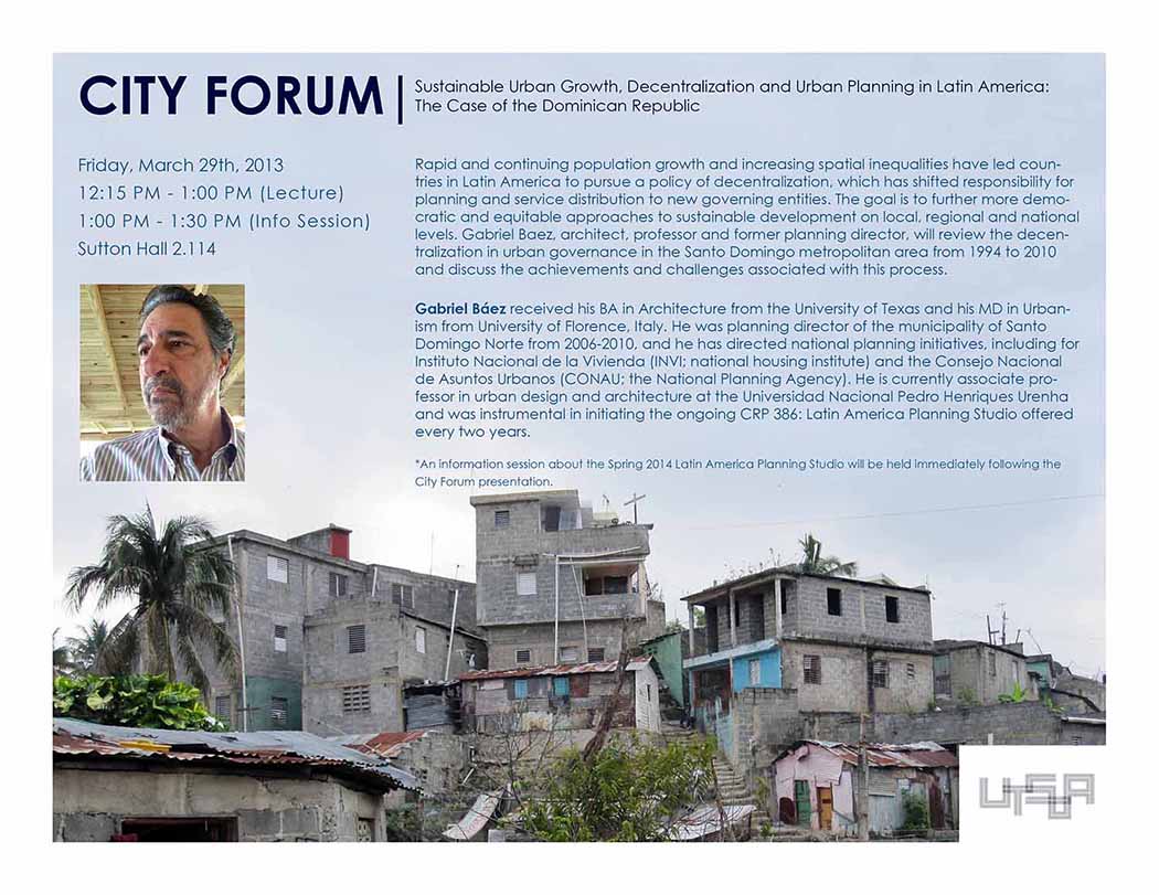 In March of 2013, we were pleased to welcome another project partner from Santo Domingo to the School of Architecture. Gabriel Baez, who was the planning director of Santo Domingo Norte when this initiative started, spoke at City Forum about the decentralization of governance in the Dominican Republic.Thank you for the visit, Gabriel!