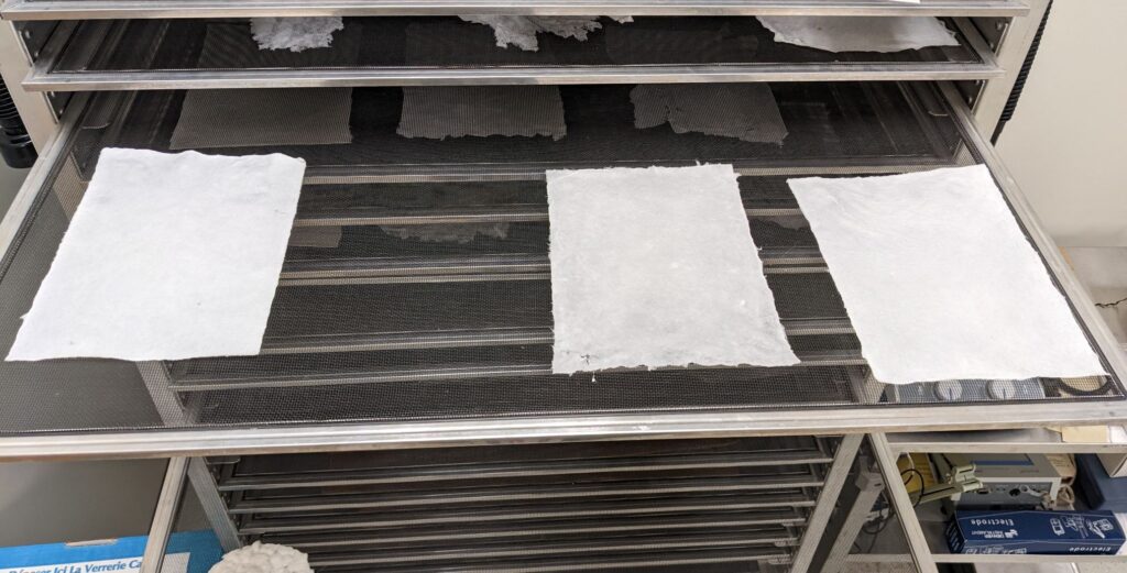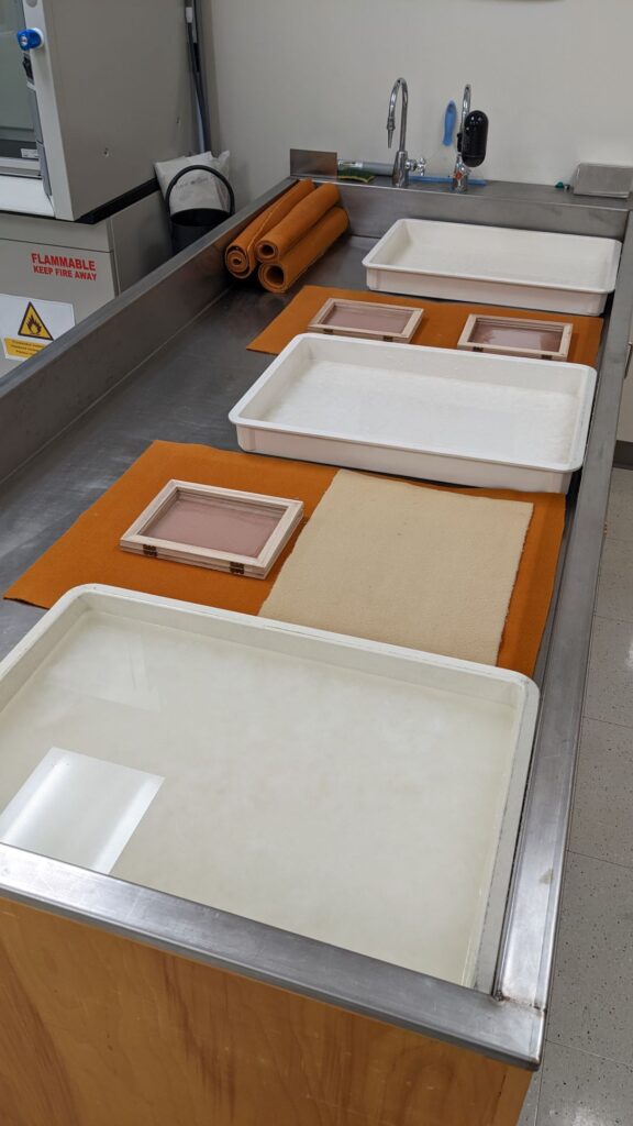 This week, students in my course INF 393C Preservation Science and Practice tried their hand at making paper. Paper is made from a vat of macerated cellulose fibers in water.