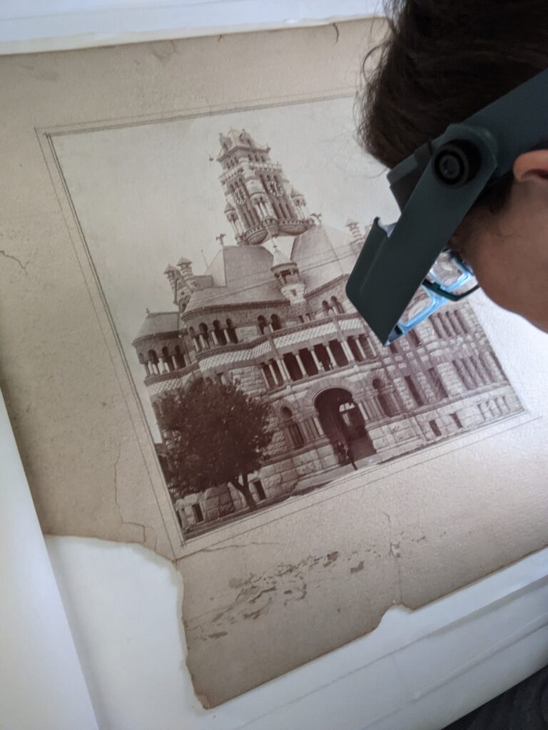 In Spring 2021, I’m pleased to perform conservation treatment on a late-19th century photograph of the Ellis County Courthouse, designed by James Riely Gordon. This item comes to us from the Alexander Architectural Archives here at UT Austin. The Ellis County Courthouse was a signature achievement in Gordon’s career designing Texas county courthouses. Construction required two million bricks, “160 car loads of Texas granite, 100 car loads of Pecos red sandstone, used in trimming the building, and 14 cars of iron”1.