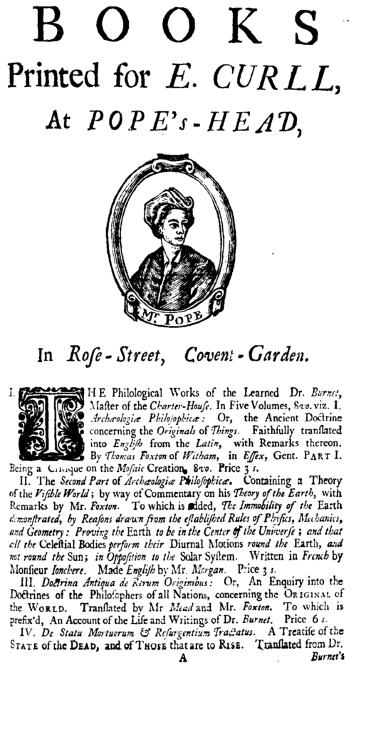 Curll, Edmund. Books printed for E. Curll, at Pope’s-Head, in Rose-Street, Covent-Garden. N.p.,[1735]. Eighteenth Century Collections Online, link.gale.com/apps/doc/CW0118263669/ECCO?u=txshracd2598&sid=bookmark-ECCO&xid=81aa35c6&pg=1. Accessed 3 Apr. 2023.