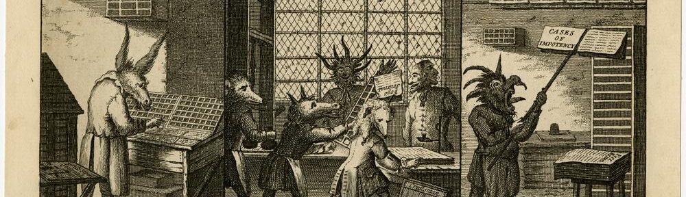 Featured Image [above]: “The Art and Mystery of Printing Emblematically Displayed,” satirical illustration of a printing house in three parts, from the Grub Street Journal, No. 147, 26 October 1732