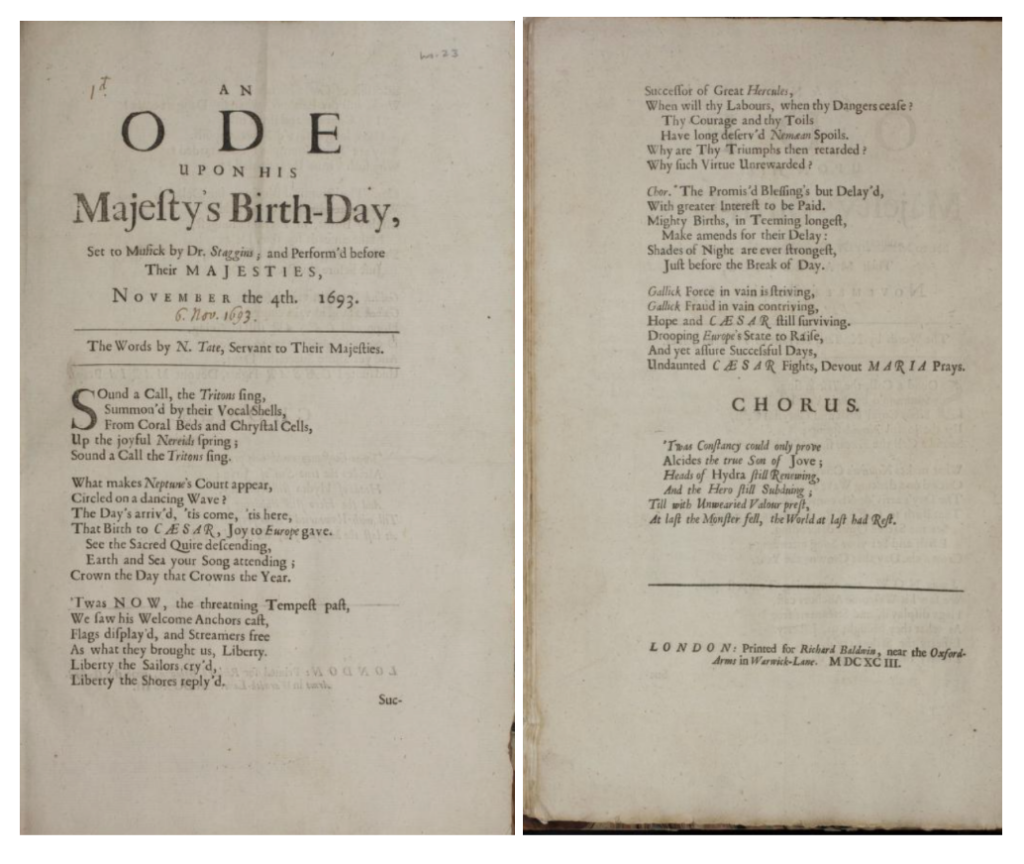 Tate, Nahum. “An Ode Upon His Majesty’s Birth-Day. Newberry Library, 1693. Internet Archive, https://archive.org/details/case_6a_159_no_23/page/n1/mode/2up. Accessed 6 April 2023.