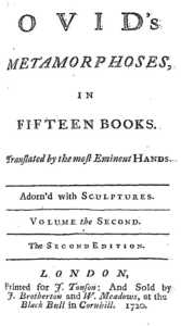 Ovid. Ovid’s Metamorphoses, in fifteen books. Translated by Mr. Dryden. Mr. Addison. Dr. Garth. Mr. Mainwaring. Mr. Congreve. Mr. Rowe. Mr. Pope. Mr. Gay. Mr. Eusden. Mr. Croxall. And other eminent hands. Publish’d by Sir Samuel Garth, M.D. Adorn’d with sculptures. … 2nd ed., vol. 2, printed for J. Tonson: and sold by J. Brotherton and W. Meadows, at the Black Bull in Cornhill, MDCCXX. [1720]. Eighteenth Century Collections Online, link.gale.com/apps/doc/CW0114237941/ECCO?u=txshracd2598&sid=bookmark-ECCO&xid=0eaf2e3a&pg=4.