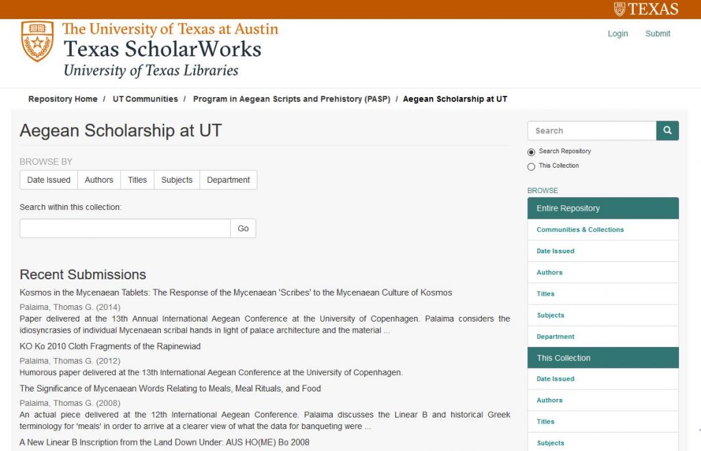 TSW’s Aegean Scholarship collection also curates faculty research on the Aegean studies. For now, this consists primarily of the scholarship currently of Thomas Palaima and Cynthia Shelmerdine.