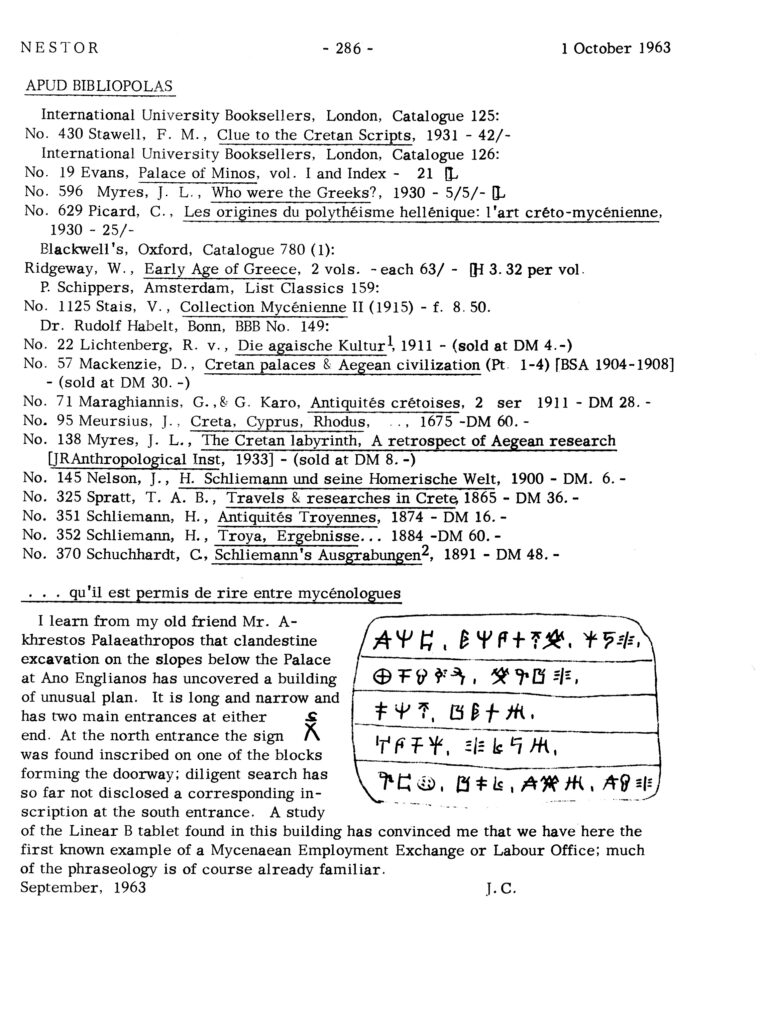 Birthday Gift Exhibit A is a tablet discovery reported to Nestor’s editor by one J.C. in the section of the old mimeographed and mailed Nestor 1 October 1963, p. 286: . . . qu’il est permis de rire entre mycénologues. This section of the monthly bibliographical journal of Aegean prehistory studies is lamentably now defunct.