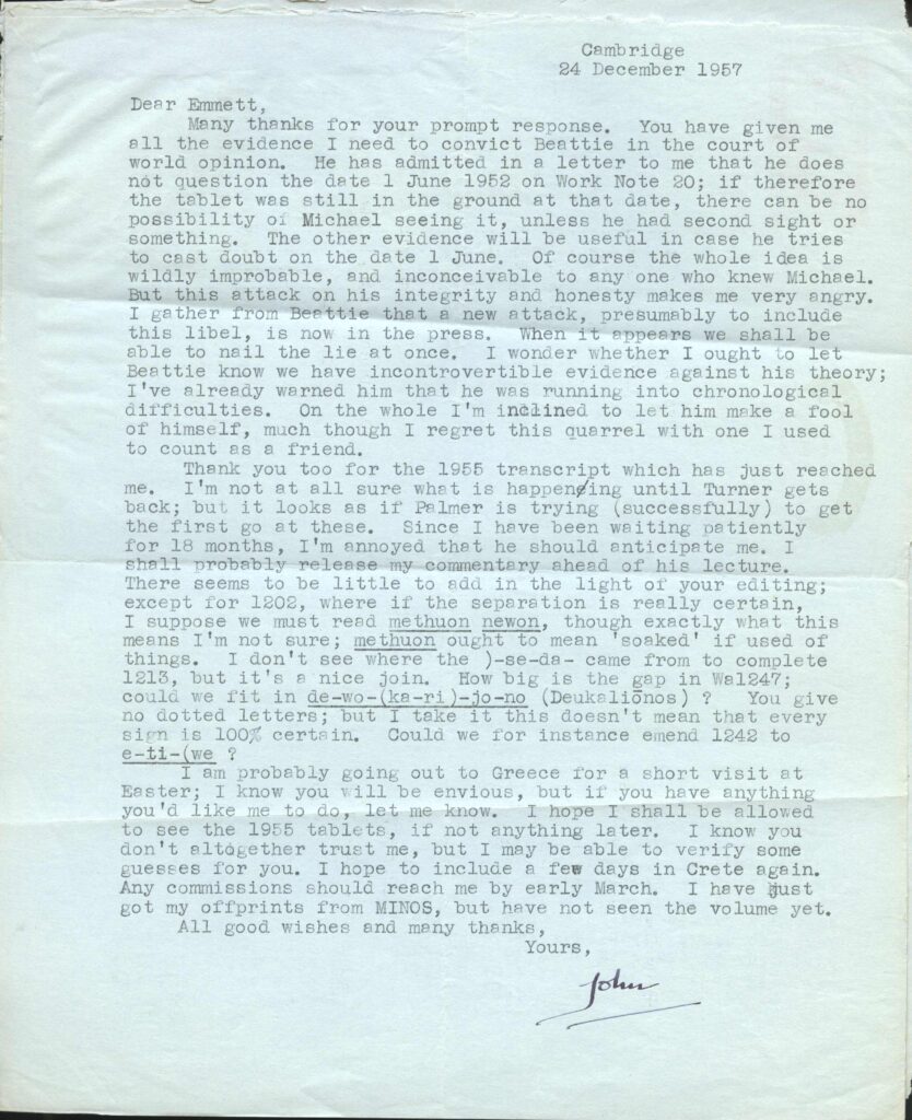 Birthday Gift Exhibit C written on Christmas Eve 1957 strikes a more somber note and reveals a justifiable undercurrent of emotion in defense of the integrity and honesty of Chadwick’s late revered and still lamented friend Michael Ventris.