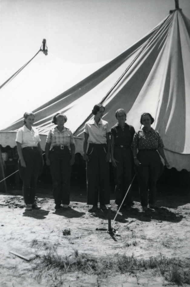 From left to right: Helen Hewitt, Delphine McCready, Pauline Vonnegut, Virginia Hunter, Alice Kober. Courtesy of: Chaco Canyon Old Timers Reunion Oral History Project Photograph Collection 1935, 7 photographic prints (8.5 x 12.25 cm.), PICT 000- 579-0003, Special Collections and Center for Southwest Research, University of New Mexico Libraries.