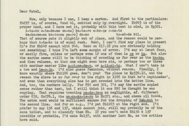 In a letter from Lang to Bennett dated January 31st, 1960 (see above), she describes how the work often included sifting through boxes of tablet fragments, even though some of the items “never had numbers (seasonal) written on them and [were] lumped together in the boxes (which often ha[d] contradictory inscriptions).” Then, like a 5,000-year-old puzzle, they had to fit them together based on their findspots, shape, paleography, sometimes even the wicker-basket markings on the backs. They also had to photograph some of the tablets. Despite these challenges, their attention to detail and appreciation for precise, well-grounded research are manifest in their writings, where they record some of the earliest readings of the Linear B tablets post-decipherment. One sees such dedication below, in a letter from October 23, 1958 from Emmett Bennett to Mabel Lang, where they also begin some of the earliest work in Mycenaean paleography, discussing sign variants and scribal hands to identify which fragments fit with each other:
