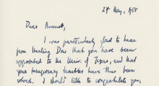 While Lang’s correspondences made up a large portion of the collection, there were other writings as well that document the turning points in Bennett’s life. Noteworthy is a letter from Evelyn Blyn dated October 10th, 1958, congratulating Bennett for his hiring at the University of Texas. His position was brief here, lasting only from 1958 to 1959. Yet, through serendipity, his writings found their way back to the university now in the PASP archives founded by one of his students, Tom Palaima.
