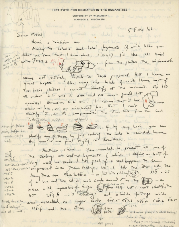 In addition to their research, Lang wrote Bennett about historical moments in their field and the reception of different publications they completed. In their letters, Lang’s style and personality shine through. In one letter, dated August 28, 1964, about the discovery of Theban tablets (see below), Lang exhibits her cleverness, the professor writing that she got away with a very early reading of most of the tablets because “the girl in charge did not know ‘til too late that I could read them.” In another letter, Lang jokes that she thinks Bennett’s ‘Flora Stamps’ are a good trademark that could set a fashion. She admits in the same letter that she has been getting more acknowledgments since the publication, “most notably from John Chadwick, who comments rather most extensively. I suppose he can’t help being slightly condescending: ‘While not agreeing with all your suggestions, I think you have made a good job of the publication.’” Lang’s humor, wit, and persistence in the pursuit of knowledge were refreshing as I read the series, letter by letter, in order to complete this project. They capture Lang’s vibrant personality, opinions and convictions, frustrations and dilemmas, and her sense of humor.