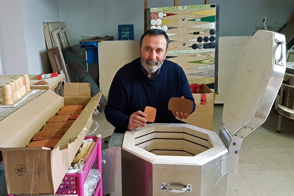 Nikos is a painter and artist based in Rüsselsheim am Main, Germany. He renders modern and ancient Greek poetry and lyrics into Linear B and then onto paintings, clay tablets and other media. These works have been exhibited across Germany and Greece since the early 1990s, and more than twenty of his artworks hang on the walls at PASP. Find more on his website here.