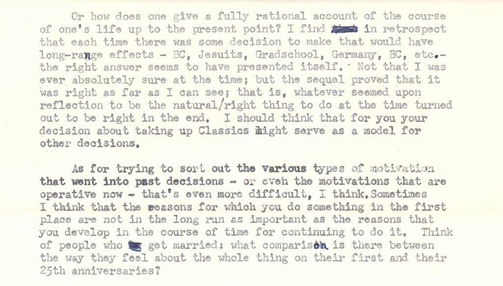 In the classroom and in the great tutorial seminars he conducted for us, Gill was focused on scholarly matters. In my senior year, Gill and four of us students read through Grote’s History of Greece during the fall semester and Gibbon’s Decline and Fall of the Roman Empire in the spring semester. We met weekly on Wednesday evenings for dinner at the Jesuit house and then two hours afterwards of discussion of the reading at hand. This was the first time I became aware that one could “be an intellectual” in the normal course of life and not just in the classroom: at the dinner table or afterwards over sherry or for that matter anywhere at all.