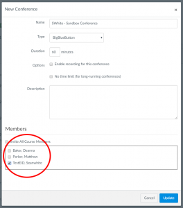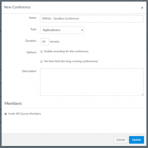 February 8, 2018, Filed Under: Media & A/V, Software & Apps, Teaching & LearningBigBlueButton Deeper Dive Take a deeper dive into BigBlueButton and learn about how you can get started using this in your Canvas course right away. Create a New Conference with BigBlueButton Invite Students to Join Your Conference Record Your Conference Share Your Conference Recording Create a New Conference with BigBlueButton Log in to Canvas. From your Dashboard page, select one of your Canvas courses. From the left-hand navigation menu of that course, select Conferences. To create a new conference (webinar, meeting, etc.) click +Conference and follow the on-screen prompts. Using the Conference scheduling options on screen, you can now schedule your BigBlueButton conference to start right away or for any future date. You can also set the time limit, whether or not you’d like to record it, and more (see image below). Next, click Update. This returns you to the conferences page. Click the Start button in the upper right-hand corner to open BigBlueButton. Your meeting opens automatically. From this point, follow the on-screen instructions to use your computer’s audio or join by phone, and test and select your webcam. Invite Students to Join Your Conference You must invite attendees to your BigBlueButton conference before you begin. Also note that only people who are already enrolled in your Canvas course can be invited*. If you wish to invite all students, leave the default options under Members as they are. However, if you wish to invite specific people, unckeck Invite All Course Members, then check the individual(s) from the list of students. When you click Update, all invitees will receive an email notification through Canvas which includes a hyperlink that will take them into your conference. * If you wish to add someone to your Canvas course, you can do this from the People tab in Canvas. Record Your Conference If you wish to record your BigBlueButton conference, you must check Enable recording for this conference in the New Conference options section before you begin (see previous images for examples). Once you begin your conference, click the Start Recording icon in the upper right-hand corner. Then, click Yes to confirm that you wish to record. When you’re finished, repeat the same steps. Click the Recording icon once again. Then, click Yes to confirm that you wish to stop recording. Share Your Conference Recording Once your conference has ended and you’re back in Canvas, it takes some time for your recording to be available. And, how long it takes depends on how long your conference was to begin with. But, once it’s available, you can return to the Canvas Conferences section of your course where you will see a small arrow icon next to the conference you just recorded (see example below). Click that arrow to expand the section and access the recording. Click the View button on the right-hand side to open and view the video. Below are some simple instructions you can send to your students or anyone else you wish to share the video with. To view the recording: Log in to your Canvas course. Click Conferences in the left-hand navigation. Click the arrow to the right of the conference session you wish to view. This expands the section revealing the video link. Click the View button to open the video and begin watching. Finally, keep in mind that this recording is ONLY available for two weeks after your conference. Click here to download this primer as a Word document. Or, if you’d like to watch two short video introductions to Big Blue Button, keep scrolling: Part 1: Getting Started Part 2: Conference Basics If you have any questions, or would like to know more, please don’t hesitate to contact me at your convenience.