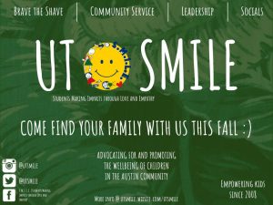 July 6, 2018, Filed Under: Career Services, Student Life, Volunteer OpportunitiesSMILE: On-campus community service organization SMILEĀ (Students Making Impacts Through Love and Empathy) is an on-campus, community service organization focused on empowering children in the Austin community. We are always looking for new members who hold a passion for impactful community service, find enjoyment working with children and seek a close-knit social group for incoming students to bond and connect. Every year, we partner with local elementary schools, children’s hospitals, and Austin-area community organizations in order to provide various types of support and assistance. The support and assistance that SMILE provides ranges from emotional support via fun activities, such as play dates for children in extended hospital stays, to logistical assistance for community events, such as helping manage interactive engineering tables at STEM night science fairs. SMILE’s main volunteering initiative involves fundraising for the annual Brave The Shave pediatric cancer benefit put on by St. Baldrick’s Foundation. SMILE raises money for St Baldrick’s through both pledge donations as well as direct donations, and all money collected goes directly to St. Baldrick’s in order to help support their efforts towards developing a cure for pediatric cancer. Brave the Shave volunteers commit to shaving their heads bare to show of solidarity for people who experienced or are experiencing the effects of pediatric cancer. SMILE’s works with these volunteers to help them meet their individual fundraising goals and in 2018 alone SMILE helped raise between $40,000 and $100,000 in events in the past years.