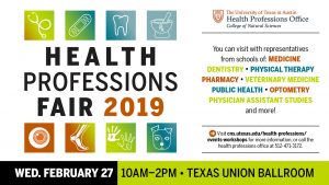 February 19, 2019, Filed Under: Career Services, Career Services EventsJob Fair: College of Natural Sciences’ Health Professions Fair The College of Natural Sciences annual Health Professions Fair is coming up on Wednesday 2/27/2019 in the Texas Union Ballroom from 10am-2:00pm. Here is the list of schools and programs attending. “The Health Professions Fair is held each spring. Approximately 550 students, alumni and community members attend. In addition, 70-75 professional schools are generally in attendance. This event is an opportunity for anyone who attends to meet and talk with admissions representatives from practically every health professions school in the state and many from across the country. We know it would be impossible for most of us to visit every school, so we bring the schools to you! All UT Austin students and alumni who are interested in finding out more about the health professions career pathway are welcome to attend. We encourage business casual attire.“