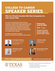 April 22, 2019, Filed Under: Career Services, Career Services EventsReminder: College to Career Speaker Series Why You Should Consider Mid-Size Companies for Your Career Path Wednesday, April 24, 2019 5:30-7 p.m. Student Activity Center, Ballroom North (SAC 2.410) RSVP at bit.ly/SpeakerSeriesApril24 Come learn about top executives’ journeys to success and understand what goes on in the minds of hiring representatives that are looking for diverse talent. We hope that you will gain insight on how to leverage yourself and competencies for different positions. While this is a technology-focused event, we believe you will gain valuable information for your current and future career goals. All students are welcome to attend. Heavy hors d’oeuvres and desserts will be served.