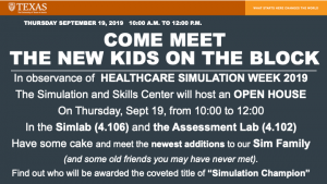 September 13, 2019, Filed Under: SON Events, Student LifeSim and Skills Center OPEN HOUSE, Thursday, Sept 19, 10 to 12 Come meet the New Kids on the Block. In observance of Healthcare Simulation Week 2019, the Simulation and Skills Center will host an Open House. When: Thursday, September 19, from 10a to noon. Where: Simlab (4.106) and the Assessment Lab (4.102) Have some cake and meet the newest additions to our Sim Family.