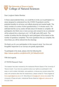 October 20, 2020, Filed Under: SON Volunteer Opportunities, Student LifeVolunteers Needed – UT Professional Acute Transition Health Study Dear Longhorn Nation Member, In these unprecedented times, we would like to invite you to participate in a study designed to understand how the COVID-19 pandemic and the potential transition to at-home work affects physical and mental health. The study consists of a series of short questionnaires (1-4 minutes each). We estimate that this survey series will take about 30 minutes to complete. All participants who finish one or more surveys and consent to be re-contacted will be entered into a drawing to win 1 of 50 gift cards ($20 each). The number of entries into the drawing for each participant will be based on the number of questions completed. The more questions that you complete, the more times you will be entered into the drawings. We thank you for your participation in this research study. Your time and thoughtful responses to our surveys are greatly appreciated. To participate in the study, please click the following link: https://utexas.qualtrics.com/jfe/form/SV_6kTxl8sa5ZwUz2d With kind regards, UT PATHS Research Team