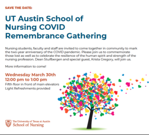 March 29, 2022, Filed Under: Important InformationUT Austin School of Nursing COVID Remembrance Gathering Nursing students, faculty, and staff are invited to come together in community to mark the two-year anniversary of the COVID pandemic. Please join us to commemorate those lost as well as to celebrate the resilience of the human spirit and strength of the nursing profession. Date: Wednesday, March 30th Time: 12pm-1pm Location: SON Fifth floor in front of the main elevators Speakers: Dean Stuifbergen and Krista Gregory