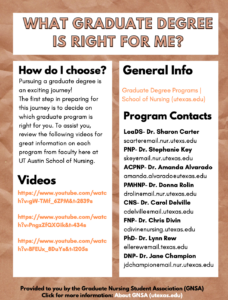 October 7, 2022, Filed Under: Important Information, SON Events, Student Life, Student OrganizationsWhich Graduate Degree is Right for You? If you are interested in graduate education or pursuing additional graduate education, the attached flyer provides links to three videos featuring UT SON faculty. Each faculty talks about their nursing career and nursing degrees. You can watch these videos at your convenience. Graduate Nursing Student Association (GNSA)
