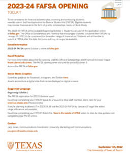 October 14, 2022, Filed Under: Important Information, Student Life2023-24 FAFSA The 2023–24 FAFSA is now open at fafsa.gov! Students planning to attend UT in 2023-24 must submit the FAFSA application to be considered for financial aid (which includes grants, scholarships, loans, and Work-Study). Please see the flyer below for more information. Contact Jacy Jones at jacy.jones@austin.utexas.edu if you have any questions!