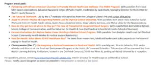November 4, 2022, Filed Under: Career Services Events, SON EventsRegister for the 2nd Healthscape Symposium! Please join the 2nd Healthscape Symposium here, hosted by Dell Medical School on Wednesday, November 30th, and Thursday, December 1st, with a special opening in the evening of November 29th. All virtual. Panels will discuss innovative work, challenges, and solutions with a cross-sectoral and interdisciplinary lens, giving a flavor for what health can look like outside of the healthcare system and doctor’s office – and in the Healthscape of people’s lives. Panelists and guest speakers are UT faculty, staff, students, regional leaders and stakeholders, community and industry partners, and national experts in policy, practice and scholarship. To learn more and register click hereĀ