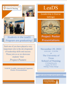 November 16, 2022, Filed Under: Important Information, Professional Opportunities, SON EventsCome view the LeaDS Poster Showcase! Stop by on the 5th floor at the School of Nursing on Tuesday, November 29, 2022, from 10:30 am to 12:30 pm to view students’ projects and presentations. The session is come and go, so come anytime, view the posters, and talk to the LeaDS students about their project! Parking locations are available at the Trinity Garage (1815 Trinity St) and the Health Center Garage (1601 Trinity St) behind the Dell Seton Medical Center. Hope you can make it!