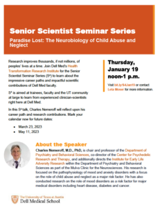 January 4, 2023, Filed Under: SON Events, Student LifeDell Med translational science seminar series (1/19) Paradise Lost: The Neurobiology of Child Abuse and Neglect Dell Medical School’s Heath Transformation Research Institute (HTRI) is excited to present the next speaker in the Senior Scientist Seminar Series (S4), highlighting experienced contributors to Dell Med’s scientific research and exploring their career path. Please join us Thursday, January 19, noon-1pm, when Charles Nemeroff, MD, PhD, will present Paradise Lost: The Neurobiology of Child Abuse and Neglect; more information is attached and you may register for this online event here. This a great opportunity for researchers who anticipate having a substantial scope of clinical interface in their career paths.