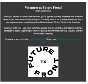 March 6, 2023, Filed Under: SON Volunteer Opportunities, Student Life, Volunteer OpportunitiesVolunteer at Future Front When you become a Future Front volunteer, you’re typically donating anywhere from five to ten hours of your time per month (it’s up to you!). Currently, most of our volunteers lend their time to our programs or our fundraising partnerships with Austin FC and Circuit of the Americas.Volunteer shifts vary—you might be helping out at a market, running an info table or working a concessions booth. Depending on what you sign up for shift times also vary. (Usually, a shift is five hours or 10 hours.)Click here to sign up for the volunteer newsletter OR you can head here to sign up for a shift now.