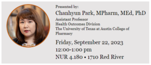 September 13, 2023, Filed Under: Important Information, Professional Opportunities2023 Fall Colloquium Series: Improving Health in Cardio-Oncology through Machine Learning Dr. Chanhyun Park serves as an Assistant Professor in the Health Outcomes Division. She earned her Pharmacy degree in South Korea and later pursued her Ph.D. in Health Outcomes Research from The University of Texas at Austin (UT) College of Pharmacy. After completing her doctorate, Dr. Park worked as a Health Economist at the Centers for Disease Control and Prevention (CDC). She then held a faculty position at Northeastern University School of Pharmacy before returning to the UT College of Pharmacy faculty. Dr. Park’s research focuses on evaluating the health outcomes of medications using quantitative methods. Her research approach encompasses pharmacoepidemiology, pharmacoeconomics, and machine learning. Through this lens, she aims to assess treatment patterns, predict potential treatment-related adverse events, and evaluate healthcare utilization and expenses. Currently, her primary research emphasis is on cardio-oncology. A light lunch (sandwich tray) will be provided. Please bring your own beverage.