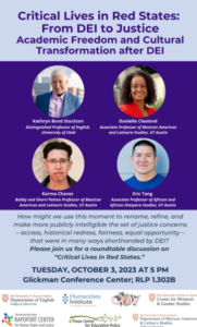 September 27, 2023, Filed Under: Student LifeRoundtable Discussion on “Critical Lives in Red States” The Rapoport Center for Human Rights and Justice invites everyone to join them on Tuesday, October 3, at 5:00pm in the Glickman Conference Center for a roundtable discussion on “Critical Lives in Red States,” a collaboration between the Rapoport Center for Human Rights and Justice, Mexican American and Latina/o Studies, the Department of English, the Department of Government, the Humanities Institute, the Texas Center for Education Policy, and the Center for Women’s and Gender Studies. Kathryn Bond Stockton, Distinguished Professor of English, former Associate Vice President for Equity and Diversity, and former inaugural Dean of the School for Cultural & Social Transformation at the University of Utah will join three UT-Austin professors, Karma Chavez, Danielle Clealand, and Eric Tang, to explore paths toward a more just university. Visit the event page for more information, and kindly share the poster (included below) with your networks.