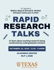 October 4, 2024, Filed Under: Important InformationMcNair and Mellon Mays Rapid Research Talks Please join us for the second Rapid Research Talks organized by the Mellon Mays Undergraduate Fellowship (MMUF) and McNair Scholars programs. The event will be held on Thursday, October 10, 2024, from 5:30-7:30 pm in RLP 1.302B. MMUF and McNair scholars will be giving 3-minute presentations of their research. Come learn about the fascinating research being conducted across disciplines. This is also a great opportunity for students to learn more about each program. Students, staff, and faculty are welcome to attend. Light refreshments will be served. NABEEHA CHAUDHARY, PhD., Senior Student Program Coordinator, McNair Program The University of Texas at Austin | Undergraduate College| nabeeha.chaudhary@austin.utexas.edu