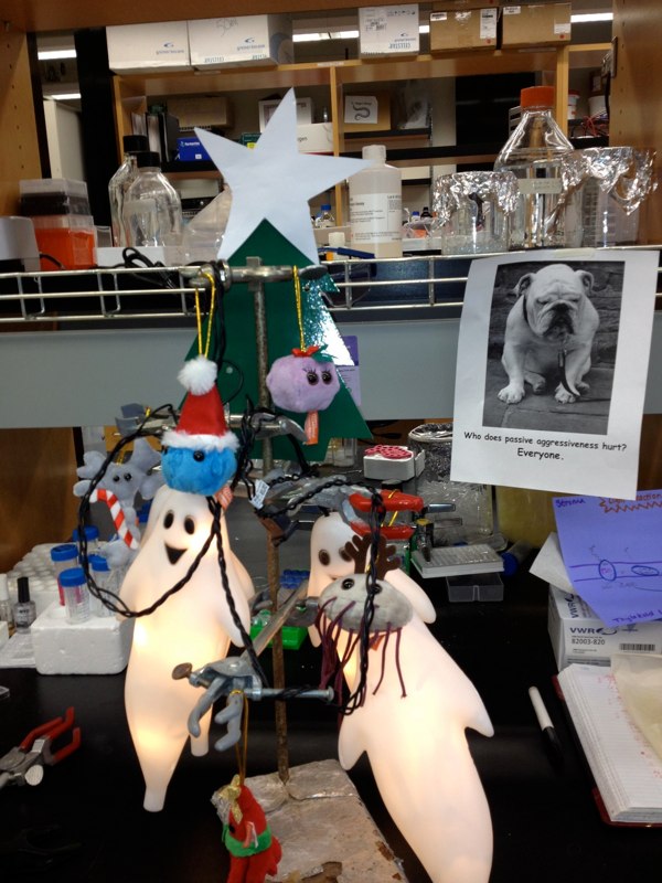 Lab Holiday Tree, note: stuffed EBV virion ornament
